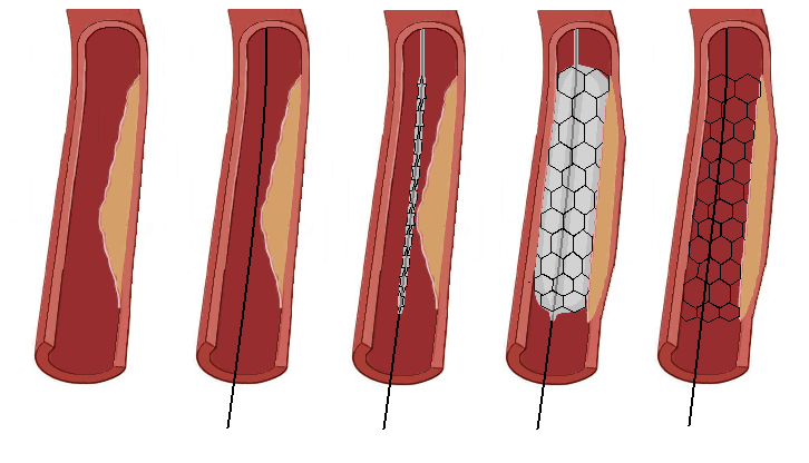When a stent is inserted into the atery and expanded in the region of a blockage, the procedure is known as "direct stenting". Some blockages may be too complicated to allow for direct stenting. When this occurs, balloon angioplasty may be required to predilate the blockage to allow the insertion of the stent. The stent is deployed in the same fashion as balloon angioplasty. When the stent platform is expanded, the balloon will expand the crimped stent to the edges of the arterial wall. The balloon is then deflated leaving the stent in place. The balloon platform is then pulled back into the guide catheter so that post stent dilation can be visualized for proper placement. Additional customization of the stent may be required to expand regions of the stent with non-compliant balloons to make sure the stent is fully deployed and match the proximal and distal segments of the artery.