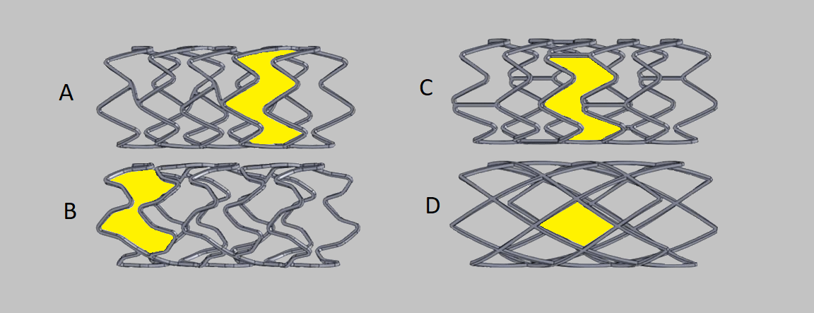Stents come in a variety of patterns as noted in the image above. Some consideration with the design of stents include patterns that provide strong radial force to maintain the integrity of the inflated stent while also providing flexibility to accomodate delivery of the stent into the tortuous anatomy of the coronary artery. The shaded regions in the above images represent the cell space of the stent. Larger areas of cell space are known as open cell and are more flexible for delivery but can present with higher rates of restenosis in those areas. The smaller closed cell are not as easily deliverable but do provide better coverage of the blocked area.
