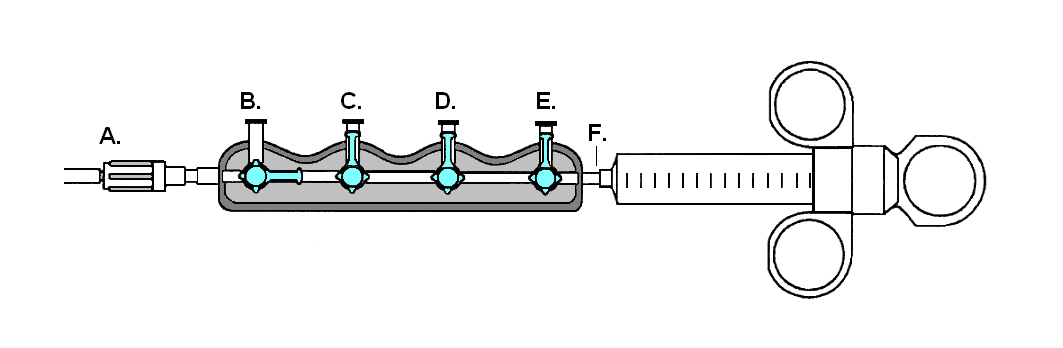 The manual manifold may be a 3 or 4 bar system of stop-cocks used for manual operation or a powered injector. Through the manifold, the operator controls the contrast injection, blood pressure monitoring, and flushes with heparinized saline. The figure below is an example of a 4-bar manifold.