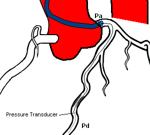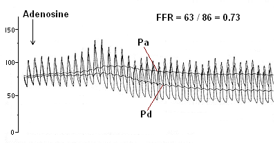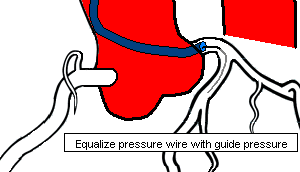 The FFR wire, a 0.014" wire with a pressure transducer near the tip, is zeroed and then advanced through the catheter to the ostium of the coronary artery. The wire pressure must then be equalized with the catheter pressure. The wire is then advanced into the coronary artery past the lesion. Once the transducer of the pressure wire is positioned beyond the lesion, baseline FFR is calculated. If the baseline FFR is greater than 0.75, then a hyperemic agent is administered (Adenosine) and FFR is calculated.