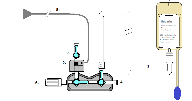 - Hand the saline spike tubing (1) off to circulator to attaching the manifold to a pressurized heparized saline bag. Flush the entire manifold to eliminate bubbles. Tap all of the connections to dislodge any air bubbles. Then close the stop cock off to pressurized saline bag.