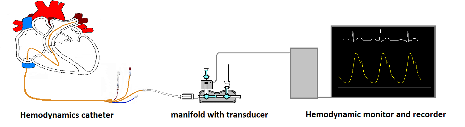 In the Cardiac Cath Lab, hemodynamics are seen in both Left Heart Catheterization (LV pressure and AO pressure) and Right Heart Catheterizatin (VC, RA, RV, PA, and PCWP). A Right Heart Catheterization is primarily performed to evaluate valvular heart disease, cardiac shunts and heart failure.