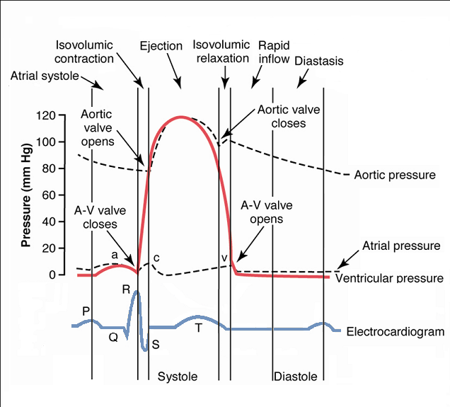Before you begin your study of hemodynamics, understand the cardiac cycle and the pressures associated with each event. This will allow you to establish a foundation to further understand abnormalities in hemodynamics. The Wiggers diagram, by Dr. Carl J. Wiggers, is an excellent resource to understand the cardiac cycle. Take your time with this diagram. Look at each phase of the ECG and visualize what is happening with the heart and the change in waveform that is produced.