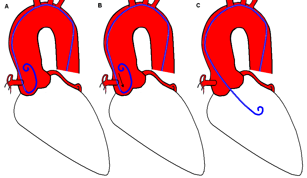 The pigtail catheter is used for LV angiography due to its ability to deliver large volumes of contrast with its end- and multiple side holes. The pigtail catheter can cross the valve directly with normal aortic valves. In many cases, it may be necessary to advance the pigtail down into one of the sinuses of Valsalva to form a secondary loop like the figure 6 A. As the catheter is withdrawn slowly B, this loop will open to span the full diameter of the aorta, at which point a very subtle further withdrawal will often cause the pigtail to fall across the valve C.