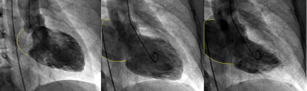 1+ - contrast refluxes into the left atrium but clears with each beat