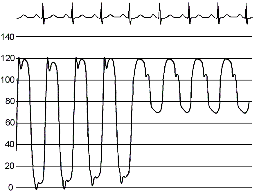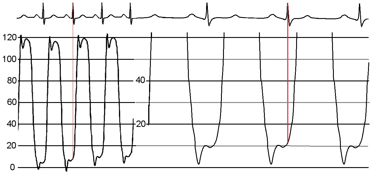 The LV pressure should be initially measured at 200 scale with a normal sweep speed of 25 mm/second. A second measurement should be taken at 40 scale and a faster sweep speed of 50 - 100 mm/second. A faster sweep speed allows for greater analysis of the waveform. Finally the last measurement is taken as the catheter is pulled back from Left Ventricle to Aorta with 200 scale at normal sweep speed. (These images have shortened the scale to provide optimal viewing of the waveform)