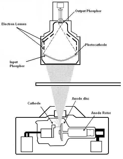 The x-ray image formed by the interaction of the x-ray beam and the patient must be detected and transformed into a visible format. The Image Intensifier captures the modulated x-ray beam emerging from the patient and converts it into a visible light to be viewed on an output screen. Image intensifiers are equipped with various sized image fields that alter the image resolution. The smaller the input screen diameter, the smaller the image field size and the sharper the resolution.