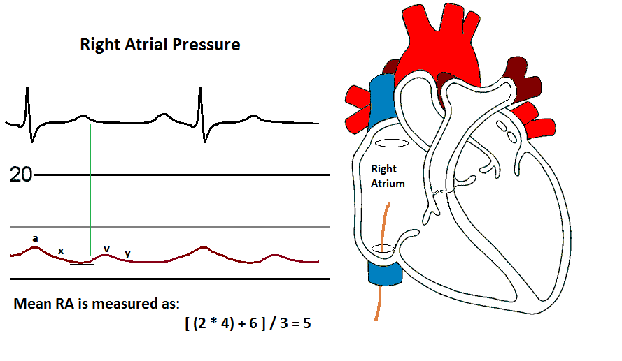 After the RV / LV matchup pressures are obtained and analyzed, the catheter is then pulled back into the Right Atrium (RA) across the Tricuspid valve. Notice how the waveform now mimics the PCWP or LA pressure waveform. It is generated from the same mechanical actions. Lets take a look at the waves of the right atrial waveform.